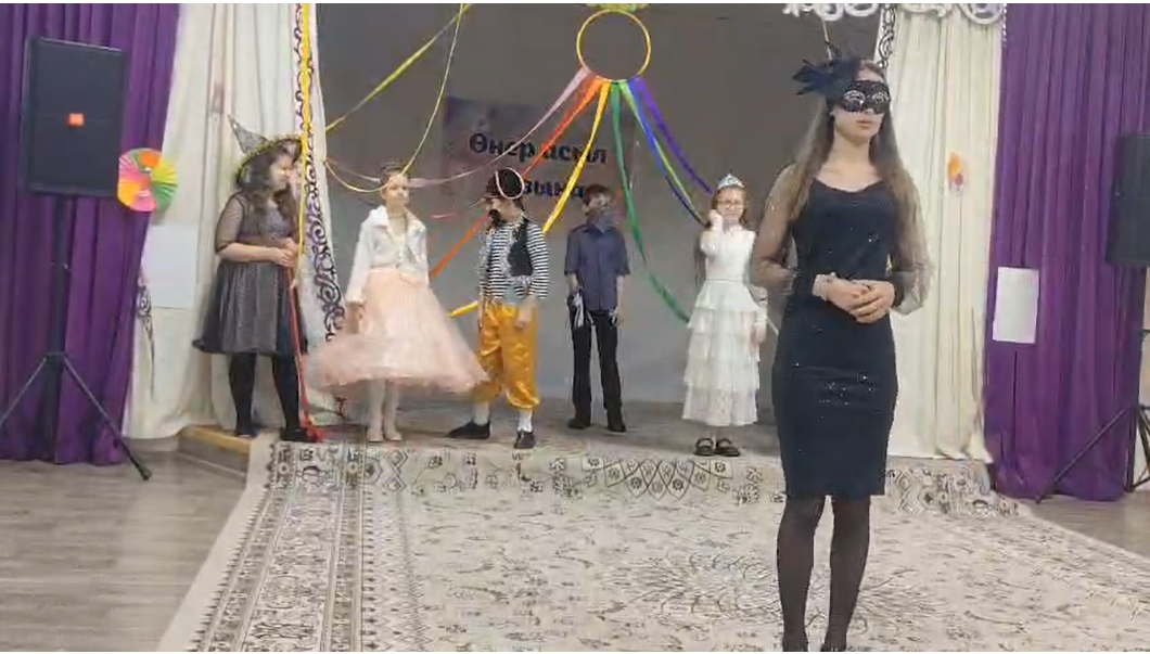 Под приглушённую музыку на сцене застыли загадочные фигуры. Маски молчали — ровно до той минуты, когда прозвучали первые слова Ведущего. С ними ожили и образы, и сам карнавал. Обычный день исчез, уступив место игре, фантазии и волшебству. На сцену один за другим выходили герои карнавального мира: весёлый Клоун, таинственная Фея Карнавала, Принцесса, Пират, Ковбой, добрая и смешная Ведьма. Но главным символом праздника стала Маска — не для тайны, а для радости, где каждый может примерить новую роль и на мгновение стать героем доброй сказки.
